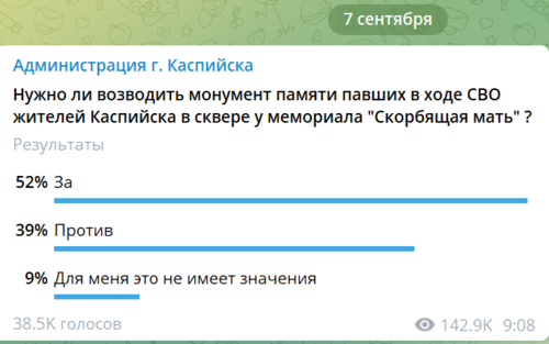 В Telegram-канале мэрии Каспийска было голосование по поводу установки монумента, сейчас оно уже недоступно, опубликованы только его результаты. Согласно им, на вопрос "Нужно ли возводить монумент памяти павших в ходе СВО жителей Каспийска в сквере у мемориала "Павшая мать?" 52% голосовавших ответили "за", 39% - "против", 9% - "для меня это не имеет значения". Всего, по данным администрации города, в опросе участвовали 38 534 человека.