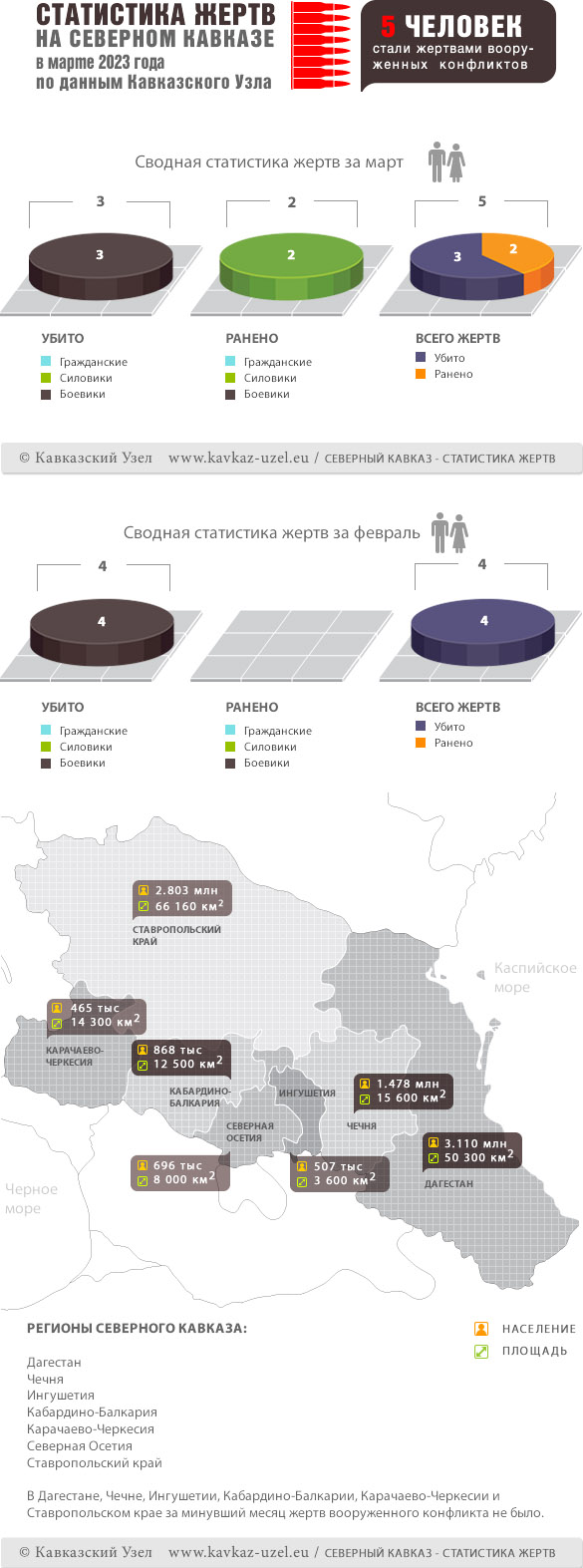 Инфографика. Статистика жертв на Северном Кавказе в марте 2023 года по данным Кавказского Узла