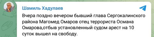 Магомед Омаров освобожден после ареста, сообщил сегодня в своем телеграм-канале зампредседателя ОНК Дагестана Шамиль Хадулаев. "Вчера поздно вечером бывший глава Сергокалинского района Магомед Омаров, отец террориста Османа Омарова, отбыв установленный судом арест на 10 суток, вышел на свободу", - написал он.