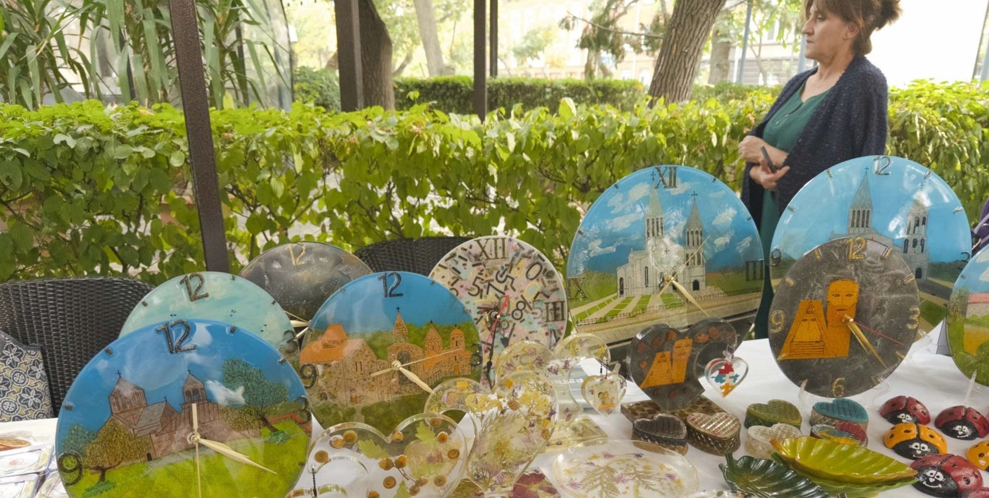 Микаел Бадалян из Аскерана представил на выставке-ярмарке коллекцию настенных часов, на которых нарисовал армянские храмы Нагорного Карабаха. Мужчина сообщил корреспонденту "Кавказского узла", что творчеством занимался много лет, но, покидая родину, не смог вывезти свои работы.