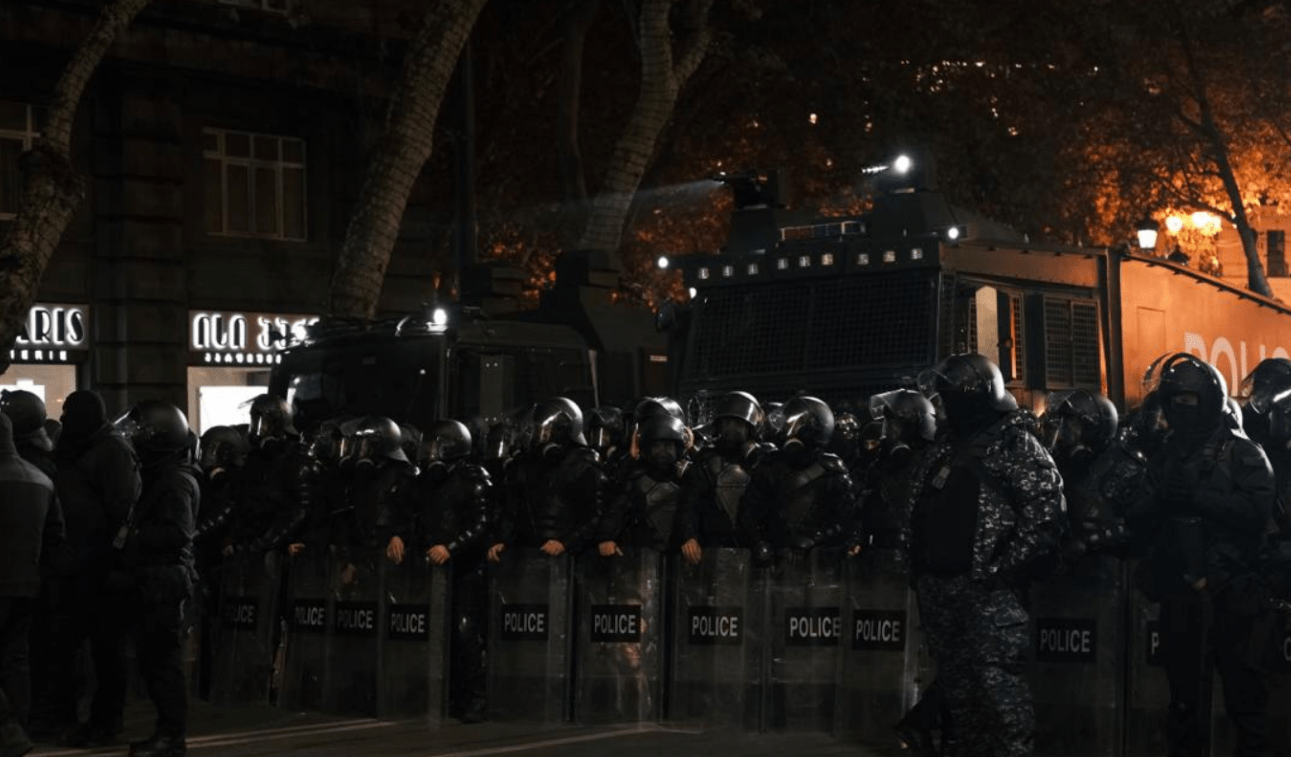 Как писал "Кавказский узел", после заявления премьер-министра Грузии о приостановке переговоров по евроинтеграции протестующие перекрыли ряд улиц в Тбилиси, у здания парламента в течение вечера и ночи происходили стычки с полицией. Силовики применили против демонстрантов слезоточивый газ и водометы, пострадали участники акции и журналисты. Сотрудники скорой помощи доставили в больницы 33 пострадавших, в том числе 16 полицейских, четырех журналистов и 13 участников протестов. Сторонники евроинтеграции заявили о создании комитета сопротивления во главе с президентом страны Саломе Зурабишвили. Сегодня протестующие вновь заблокировали движение у парламента, к зданию стянуты силовики и спецтехника.
