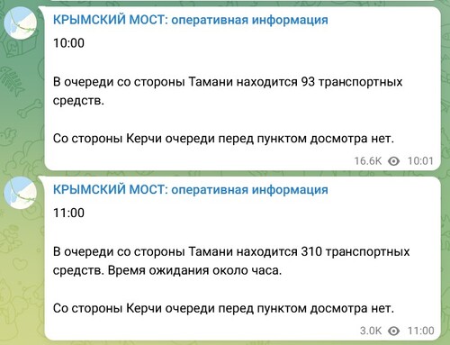 "Подъехали со стороны Тамани в 09.40. На досмотр - 10.25. Выехали на мост в 10.37", - написала Maldaeva. "В Крым растет пробка, начинается Большой Турпоток июля", - написал в 09.45 мск администратор чата Oleg Volodin.