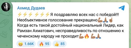 На решение Центробанка отреагировал вечером 12 октября Ахмед Дудаев, назвав это "победой". "Я поздравляю всех нас с победой!!! Необъективное голосование прекращено. Когда есть такой достойный национальный лидер как Рамзан Ахматович, несправедливость по отношению к чеченскому народу не проходит", - написал он.