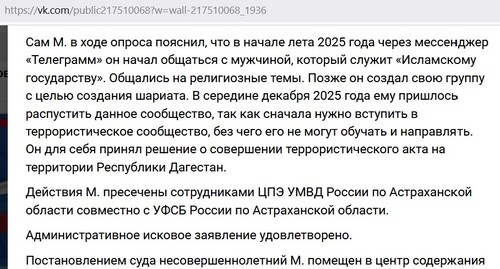 "Сам М. в ходе опроса пояснил, что в начале лета 2025 года через мессенджер "Телеграмм" он начал общаться с мужчиной, который служит "Исламскому государству" (террористическая организация, запрещенная в России судом. - Прим. "Кавказского узла"). Общались на религиозные темы. Позже он создал свою группу с целью создания шариата (так указано в публикации. - Прим. "Кавказского узла"). В середине декабря 2025 года ему пришлось распустить данное сообщество, так как сначала нужно вступить в террористическое сообщество, без чего его не могут обучать и направлять. Он для себя принял решение о совершении террористического акта на территории Республики Дагестан", - отмечается в публикации.