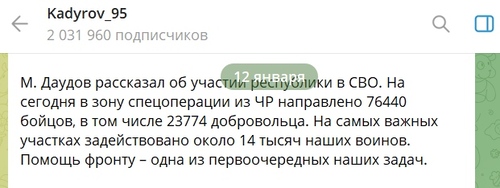 12 января на совещании с участием представителей всех органов власти выступил с докладом председатель правительства Чечни, начальник регионального оперативного штаба по проведению СВО Магомед Даудов, сообщил в своем телеграм-канале Рамзан Кадыров.