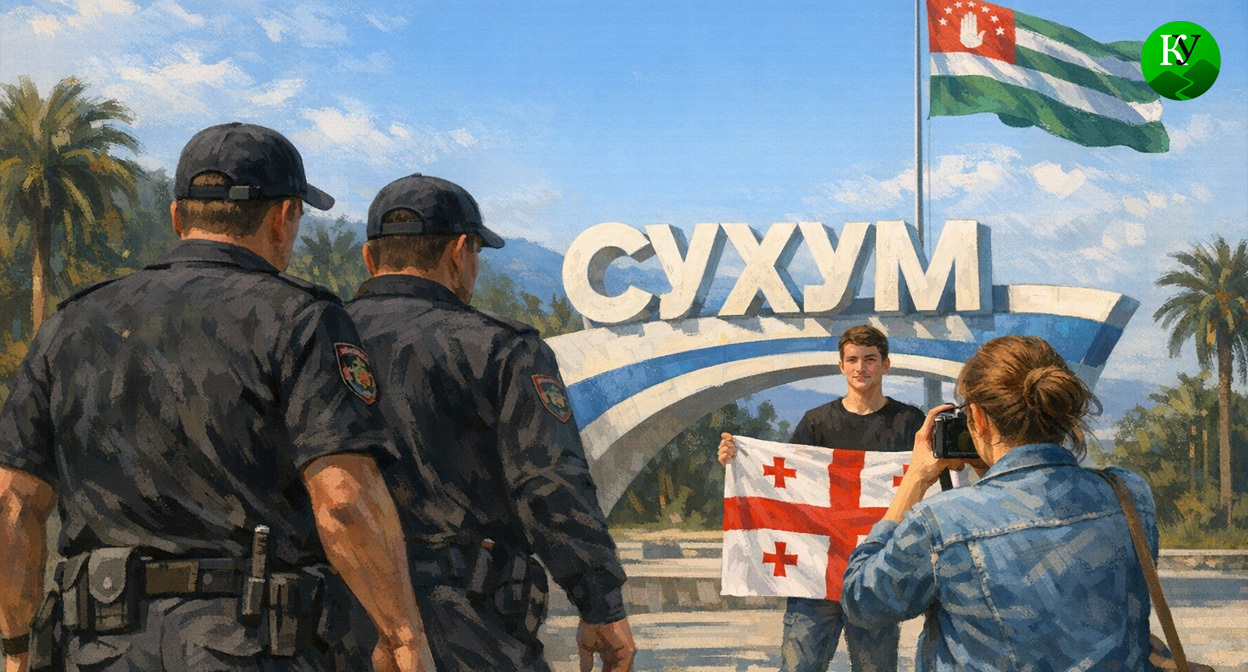 Жителей Сочи, которые фотографировались на въезде в Сухум с грузинским флагом, задержали сотрудники Службы государственной безопасности Абхазии.
