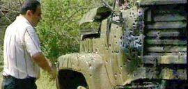 При взрыве уничтожен один принадлежащий военным автомобиль и сильно поврежден другой. По рассказам очевидцев, солдат разметало в разные стороны. Взрывной волной разворотило две водопроводные трубы, и потоки горячей и холодной воды хлынули на залитый кровью асфальт. На месте погибли десять человек. От осколков и кусков нарезанной арматуры армейские бронежилеты защитить не смогли, сообщает НТВ.