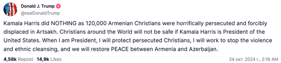 В своей соцсети “Truth Social” Трамп заявил, что «Камала Харрис не сделала ничего, чтобы предотвратить преследование и изгнание 120 000 армян христиан из Арцаха». Также, он сказал, что при президентстве Камалы Харрис, христиане по всему миру будут под угрозой, а он не позволит этого делать, будет работать над предотвращением насилия и этнических чисток, а также восстановит мир между Арменией и Азербайджаном.