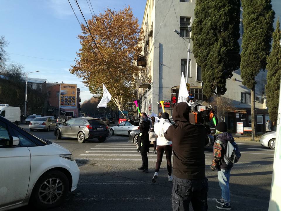 Фото: активисты движения  "Иаре пехит" (Ходи пешком) проводят акцию на пешеходном переходе в центре Тбилиси. Источник: https://www.newsgeorgia.ge/meriya-tbilisi-soobshhila-o-novyh-dorozhnyh-zebrah-vmesto-peshehodnyh-mostov/