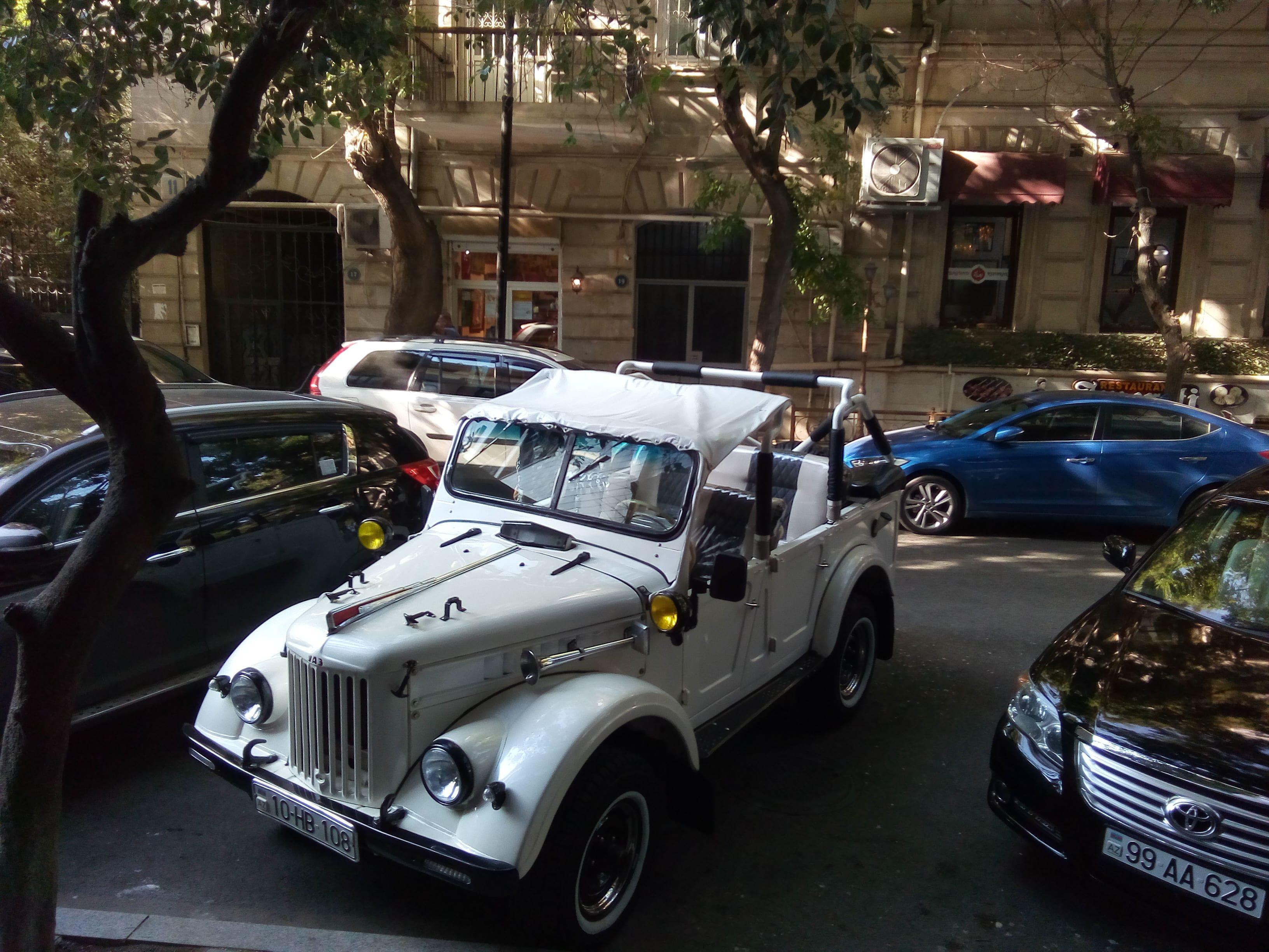 В Баку, у ресторана "Султан" заметил припаркованную ностальгию по СССР на четырех колесах. "Газик" переделанный в городской компакт-кроссовер. Аутентичность порушена, о вкусе не спорят, хозяин явно человек веселый, налепил на машину все что нашел "с того времени". Не обременен стремлением сохранить в автомобиле все как было до последнего винтика. Восстановил так, как мог и хотелось. Это тоже форма ностальгии по прошлому. А что моему поколению вспоминать, если в нашем личном прошлом ничего кроме СССР не было?