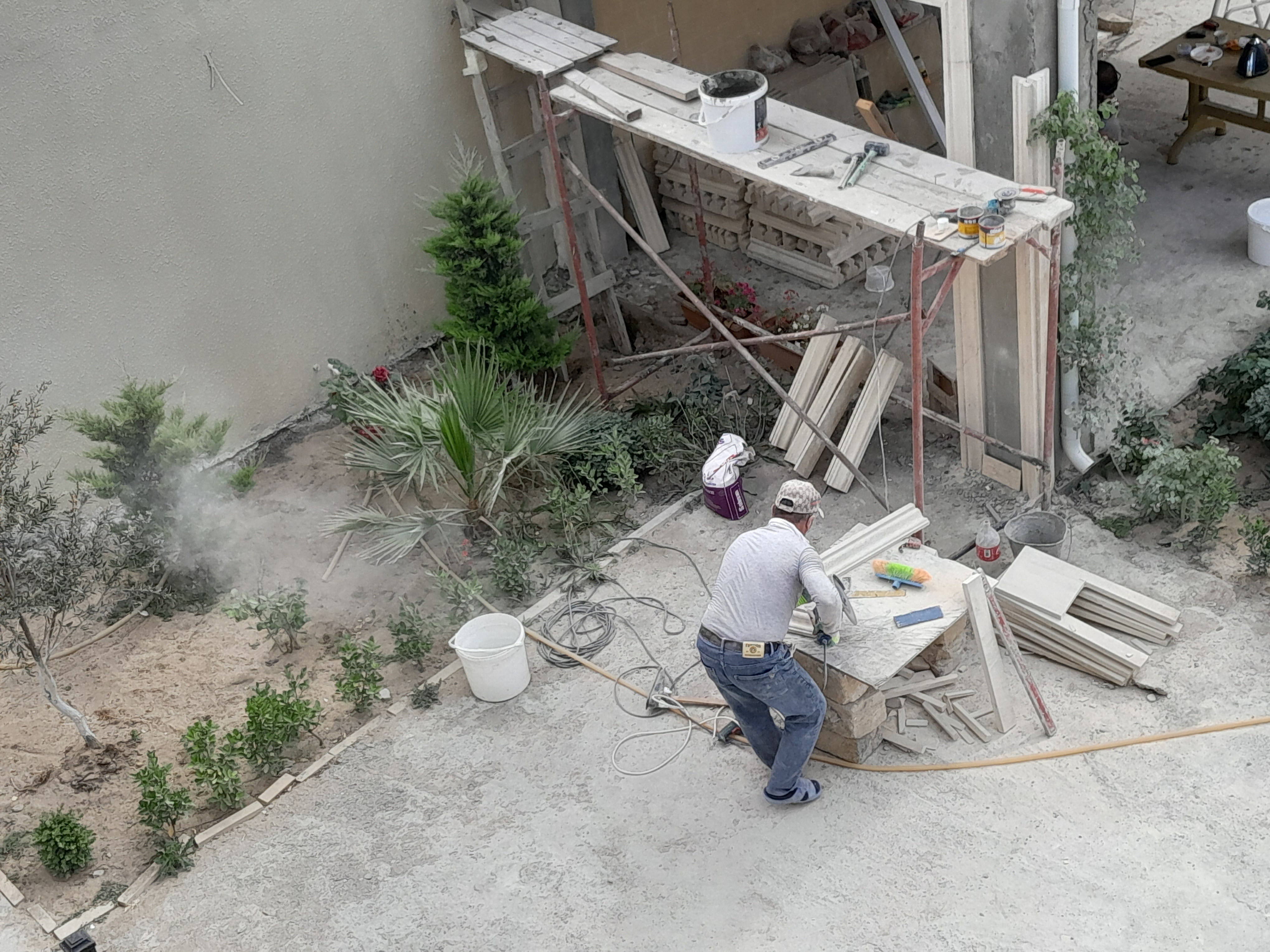 Во дворе работают мастера. Один облицовывает известняковой плиткой каменную беседку. Лагундой режет известняк, этим же инструментом шлифует поверхность камня. Белая пыль как дым, бьет из лагунды прямо в лицо мастеру и ветром распространяется на двор. Все в белой пыли, а лицо мастера - брови, нос, глаза, покрыты слоем известняка. Защитные средства - очки, воздушный фильтр на рот и нос, мастер не использует. Само-собой, каска, страховочный ремень при работе на лесах тоже не применяется - их у него просто нет.