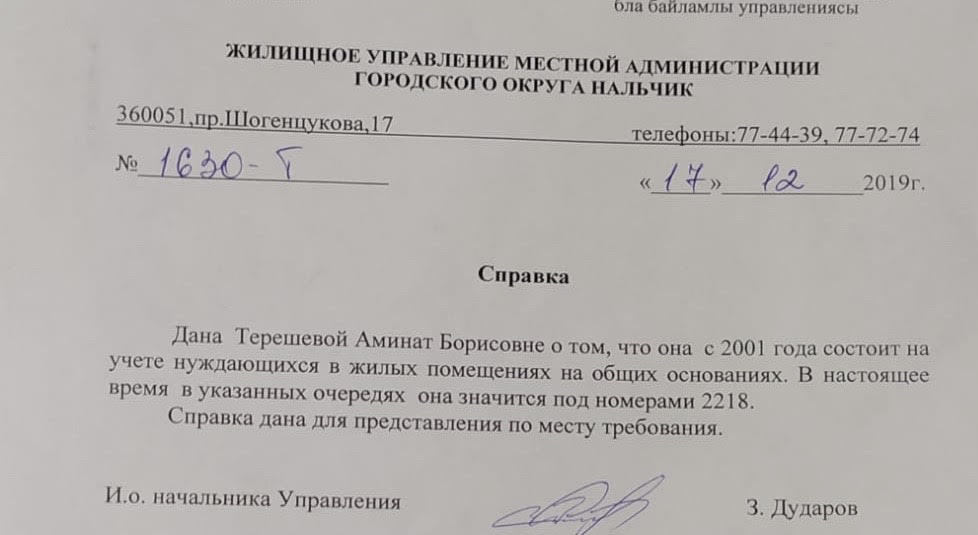 В частности, одна из женщин, проживающих в общежитии, Аминат рассказала, что жилплощадь в общежитии получал ее покойный муж, работавший водителем автобуса, еще в 1988 году. С 2001 года ее семья стоит в очереди на получение квартиры в администрации Нальчика. У нее два сына, старший из них женат и имеет двоих детей. Аминат с семьей прописана в общежитии, где занимает две комнаты, другого жилья семья не имеет.