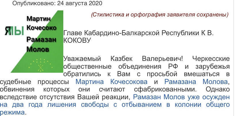 Черкесские общественные объединения просят главу вмешаться в защиту прав Мартина Кочесокова и Рамазана Молова, так как считают, что обвинения против них сфабрикованы. Заявители апеллируют к тому, что у Кокова как у гаранта Конституции Кабардино-Балкарской Республики «достаточно полномочий для пресечения неправомерных действий сотрудников федеральных структур».