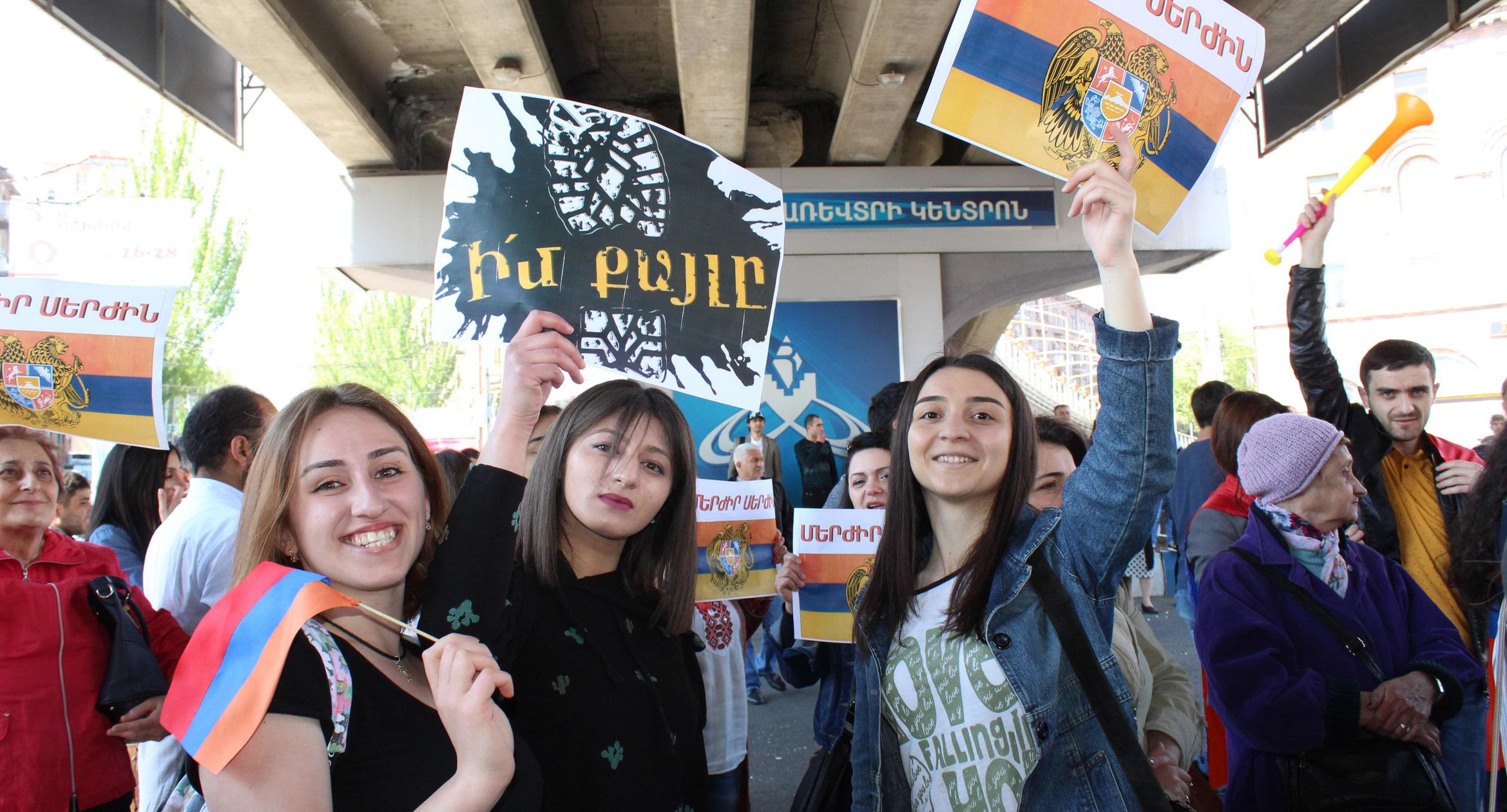 Сотни тысяч человек собрались на площади Республики в Ереване, где проходит митинг оппозиции. Протестующие празднуют отставку Саргсяна и поздравляют друг друга. Ереван, 23 апреля 2018 г. Фоторепортаж корреспондента “Кавказского узла” Тиграна Петросяна