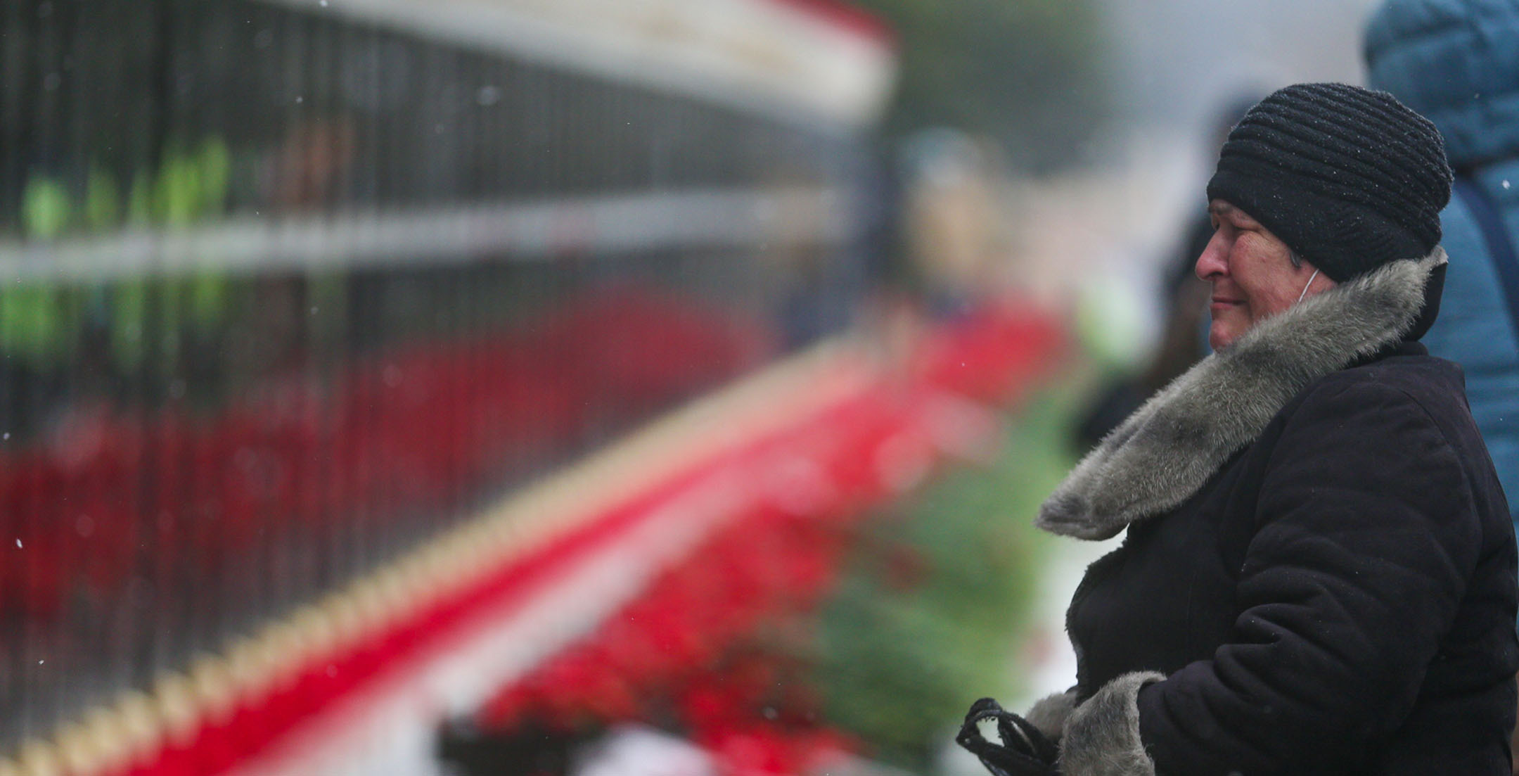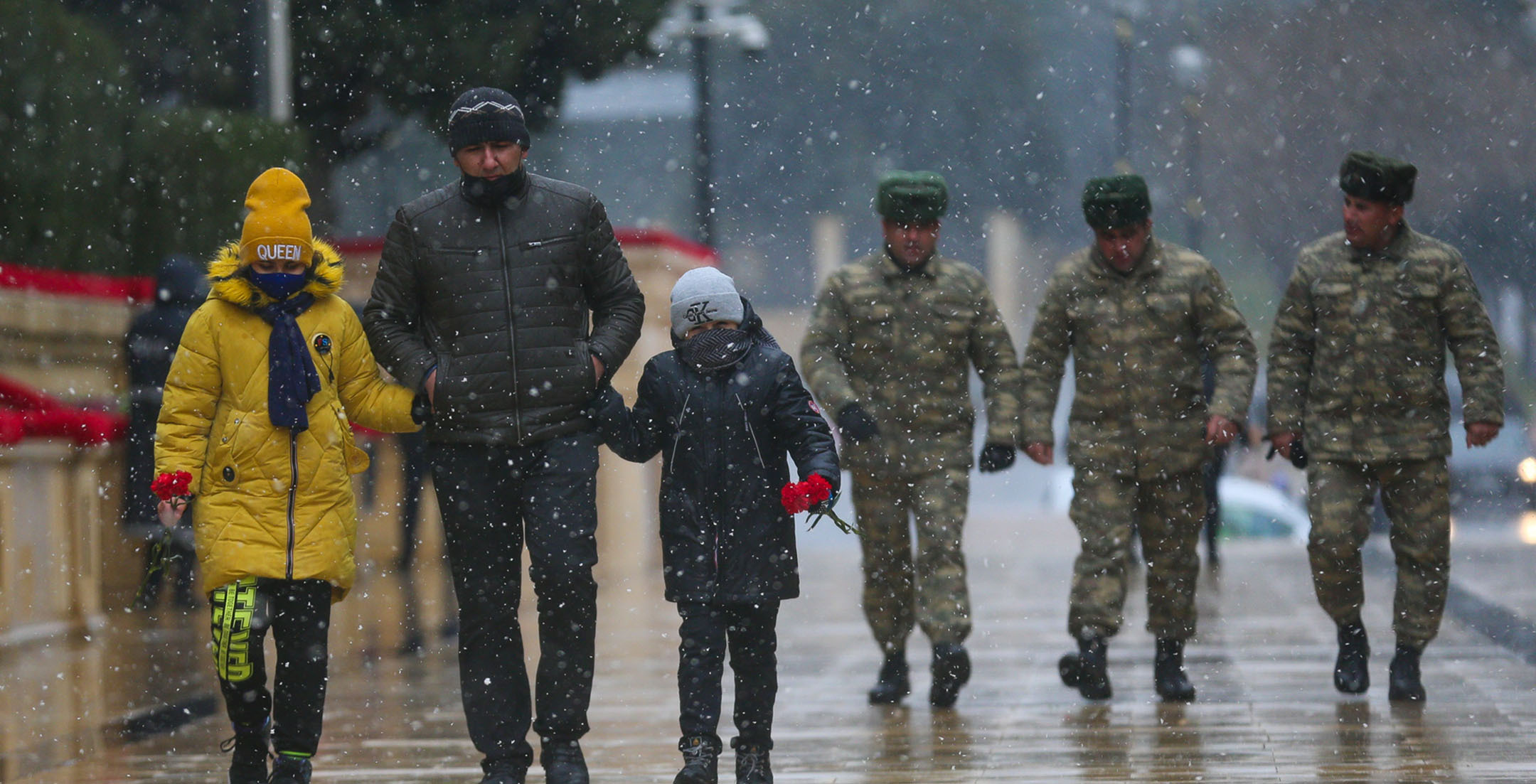 Жители Баку в 32-ю годовщину событий “Черного января” идут к Мемориалу шехидов, чтобы почтить память погибших после ввода войск в Азербайджан 20 января 1990 года. Несмотря на сильный ветер и мокрый снег, к мемориалу идут целыми семьями, с детьми, несут флаги и цветы. Баку, 20 января 2022 года. Репортаж фотокорреспондента “Кавказского узла” Азиза Каримова.